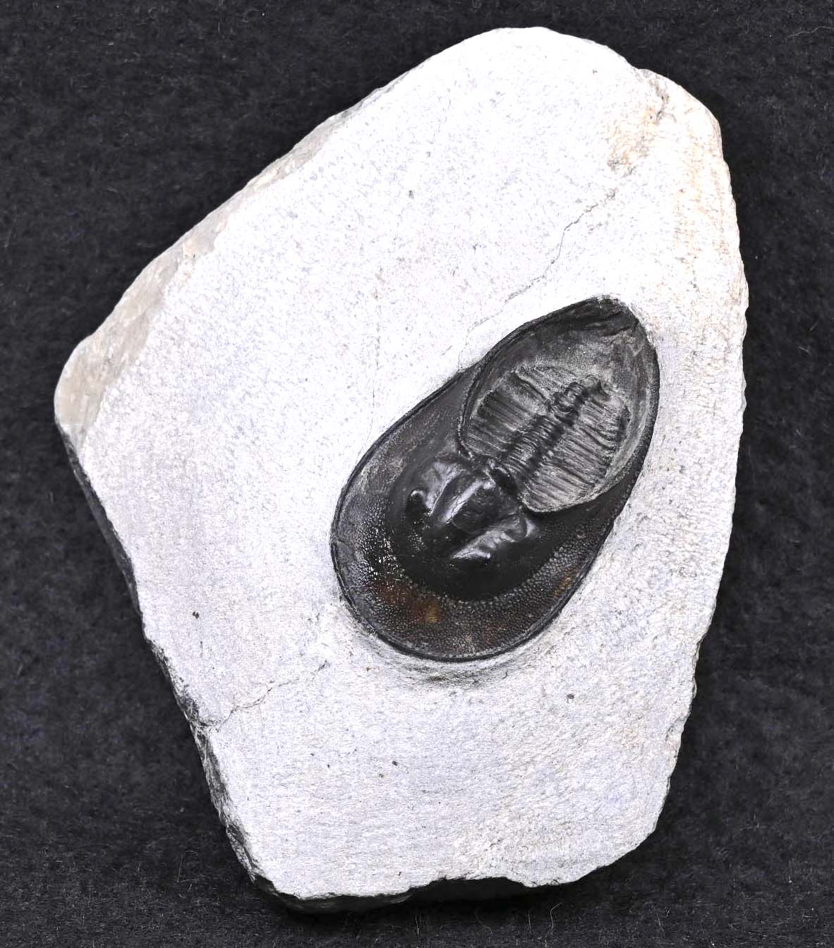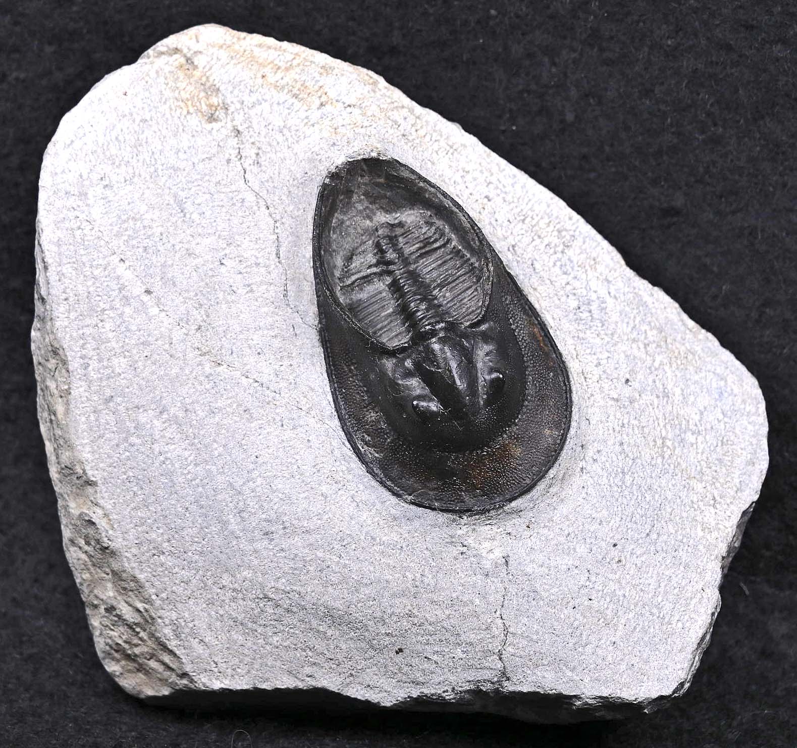 The trilobite measures 1.99 inches long, from the tip of the shield to the tips of the spines, and 1.11 inches wide. The trilobite and matrix measure 4.0 by 3.44 by 1.86 inches. The specimen has been repaired through the right side of the preglabellar shield.