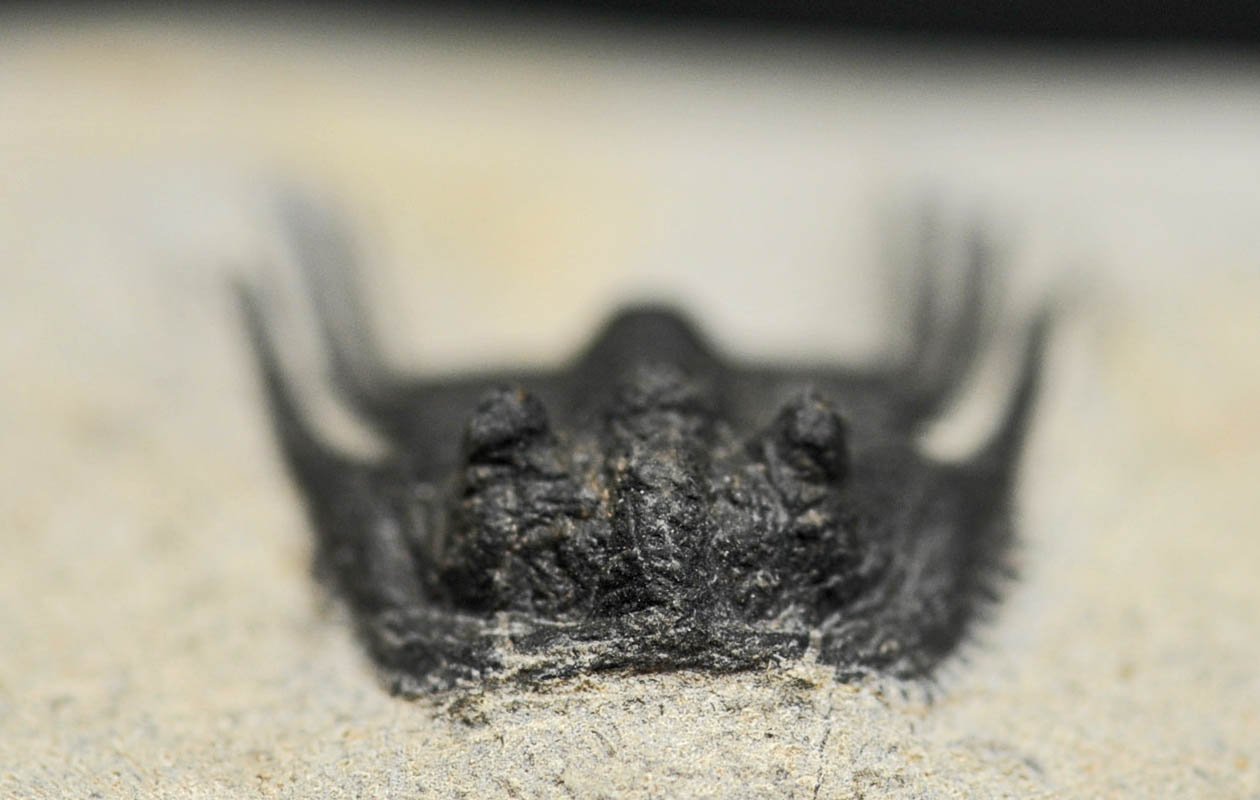 The body of the trilobite is 0.95 inches long (does not include the length of the spines) and 0.75 inches wide. The entire specimen, matrix and trilobite, measures 2.85 inches long, 2.65 inches wide and 1.45 inches high.