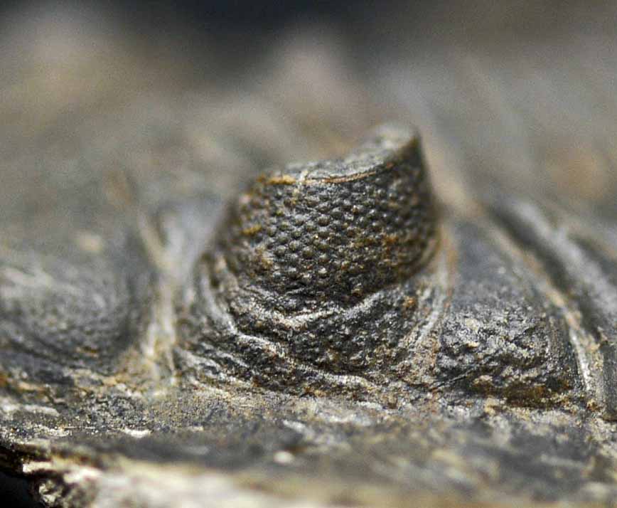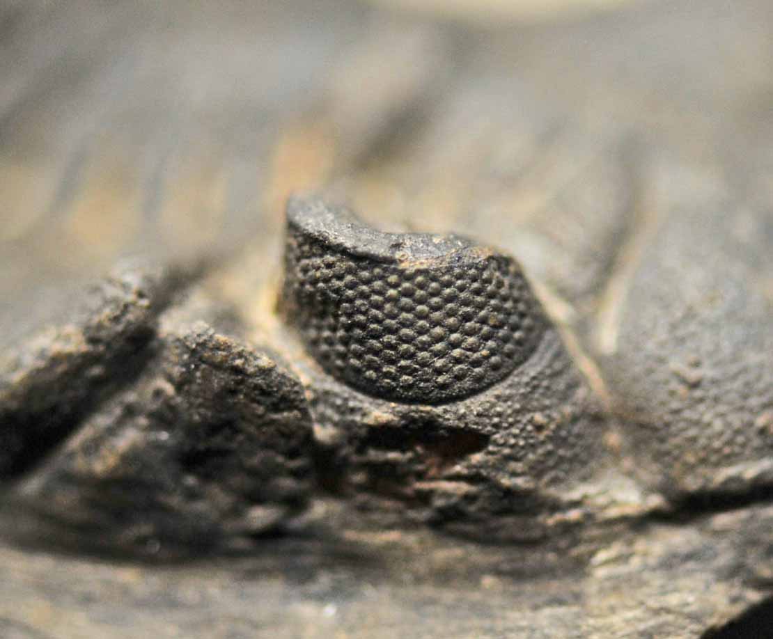 The trilobite is 2.65 inches long, 1.55 inches wide and 0.4 inches high. The trilobite with the matrix is 3.75 inches long, 2.95 inches wide and 3.0 inches high. The schizochroal lenses in both eyes are well-preserved.