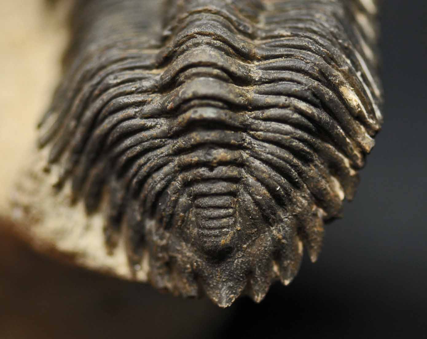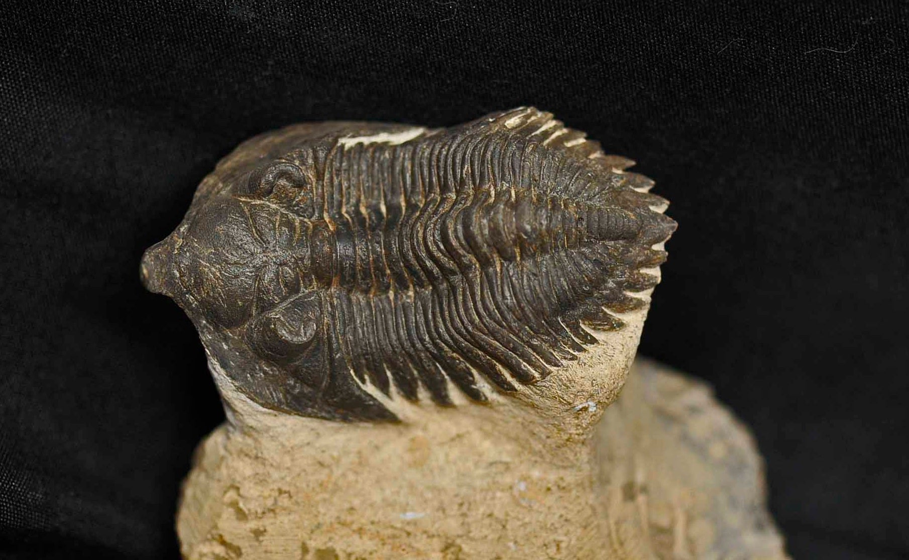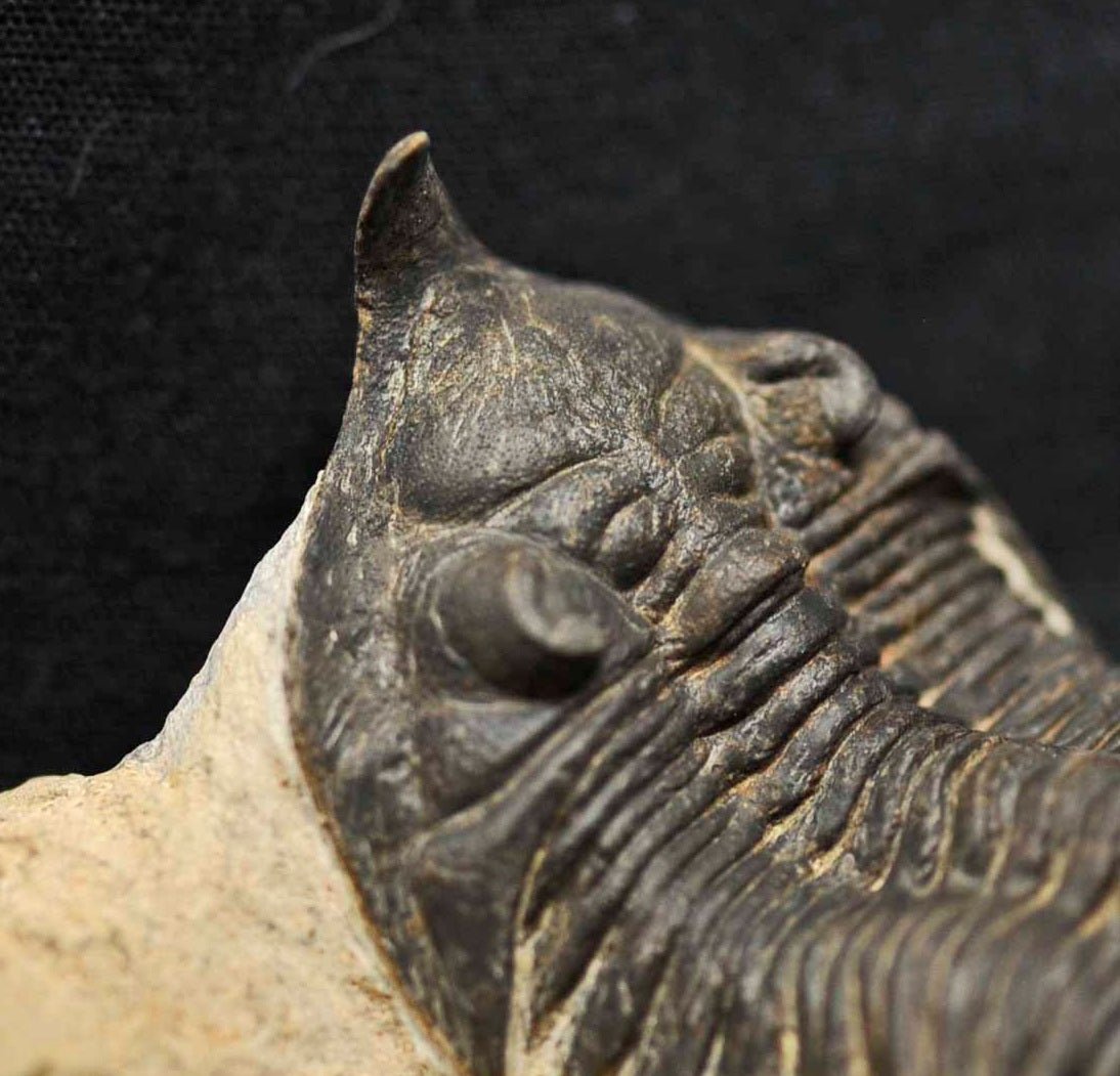 The right cheek has been restored. The trilobite will be mailed out in a customized container and screwed in place. There is a screw going into the matrix, but in no way does it compromise the trilobite.
