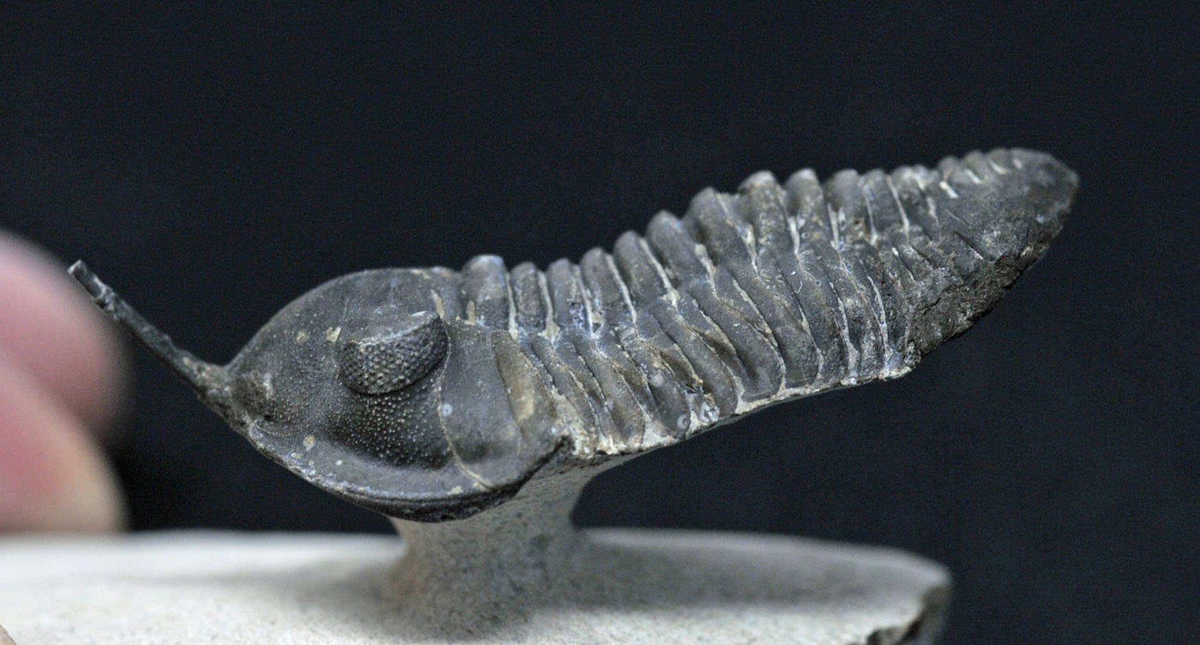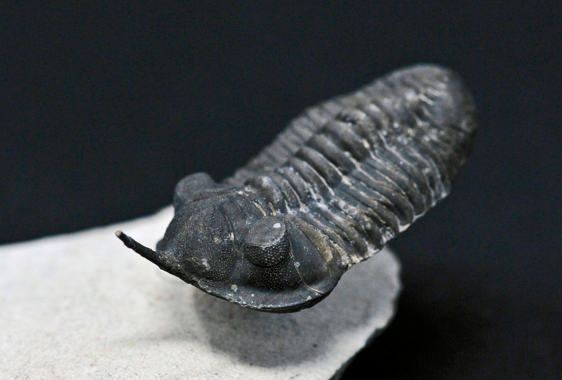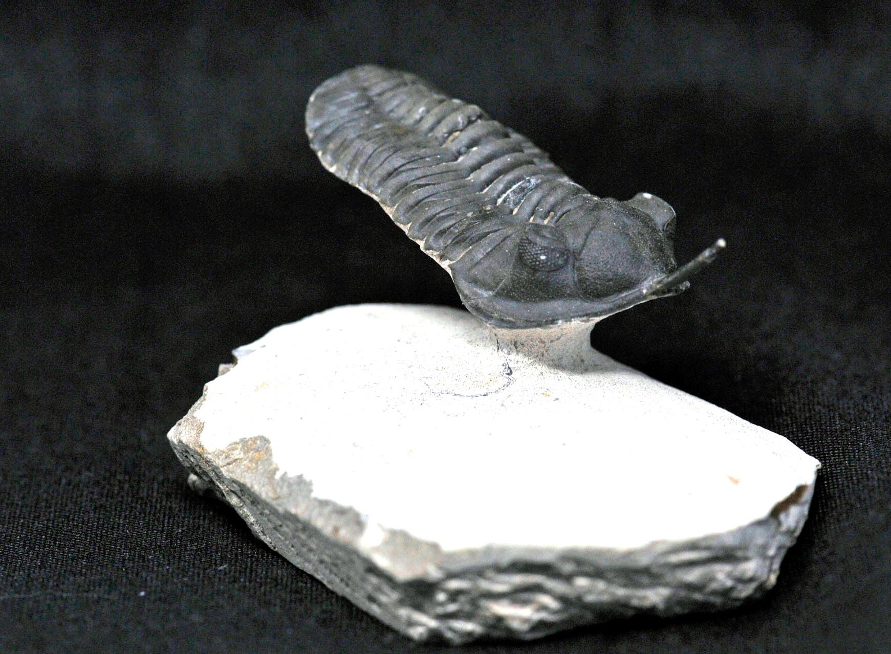 The schizochroal lenses in both eyes of the trilobite are exteremely well-preserved.The trilobite body is 1.65 inches long and 0.95 inches wide. Trilobite with the rostral spine is 2.0 inches long. Matrix and trilobite is 2.85 inches long, 2.0 inches wide na 1.55 inches high. The trilobite has been freed fro the matrix except for a small pillar which attaches it to the base, The specimen will be mailed out in a container which has been customized to secure the trilobite to the container. Therefore, there will be one screw hole in the matrix. This in no way compromises the integrity of the trilobite.