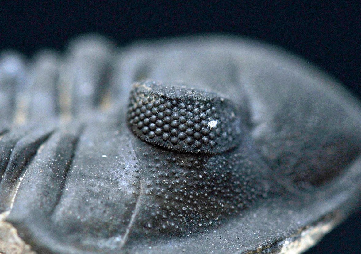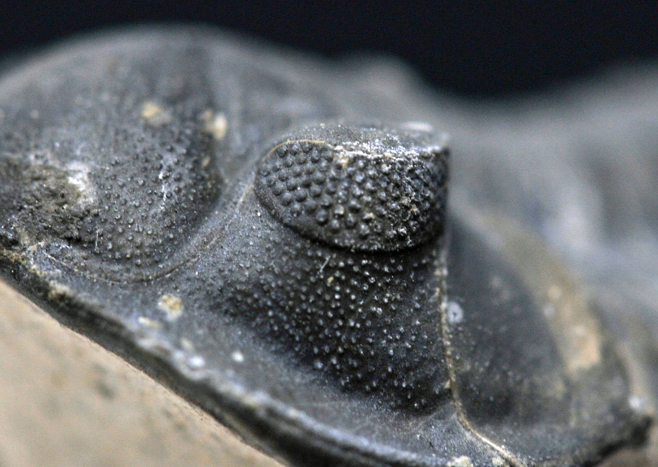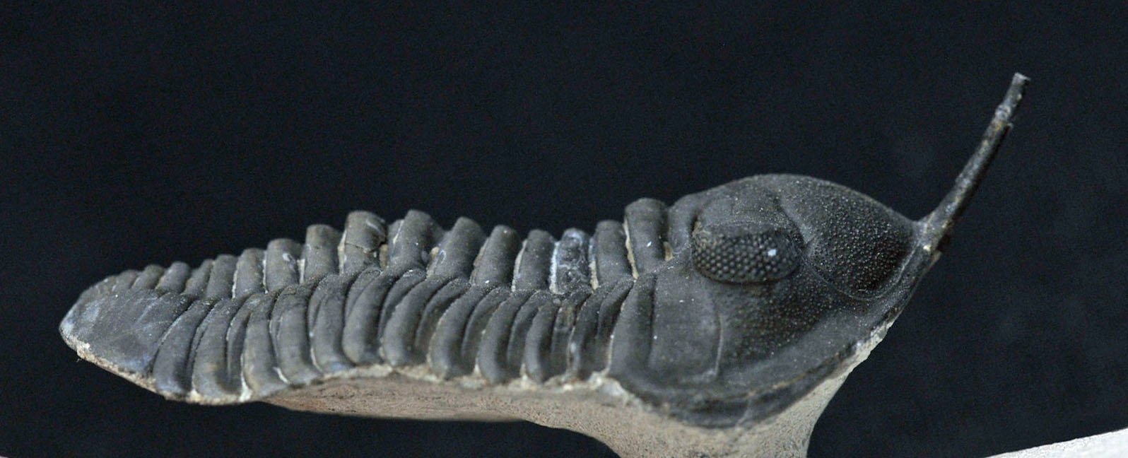 The schizochroal lenses in both eyes of the trilobite are exteremely well-preserved.The trilobite body is 1.65 inches long and 0.95 inches wide. Trilobite with the rostral spine is 2.0 inches long. Matrix and trilobite is 2.85 inches long, 2.0 inches wide na 1.55 inches high. The trilobite has been freed fro the matrix except for a small pillar which attaches it to the base, The specimen will be mailed out in a container which has been customized to secure the trilobite to the container. Therefore, there will be one screw hole in the matrix. This in no way compromises the integrity of the trilobite.