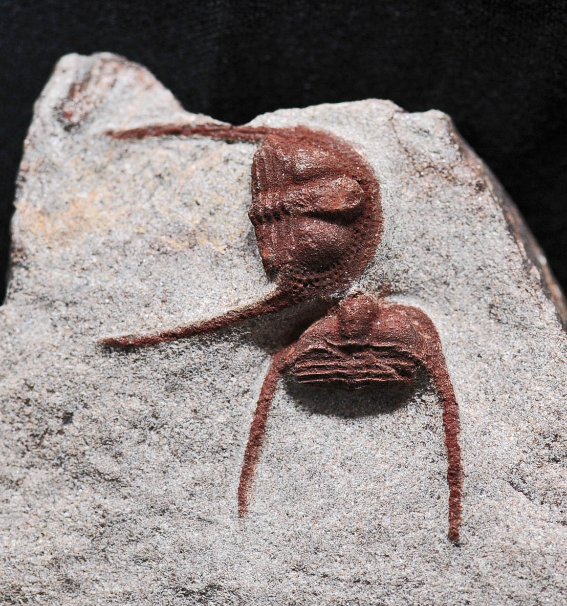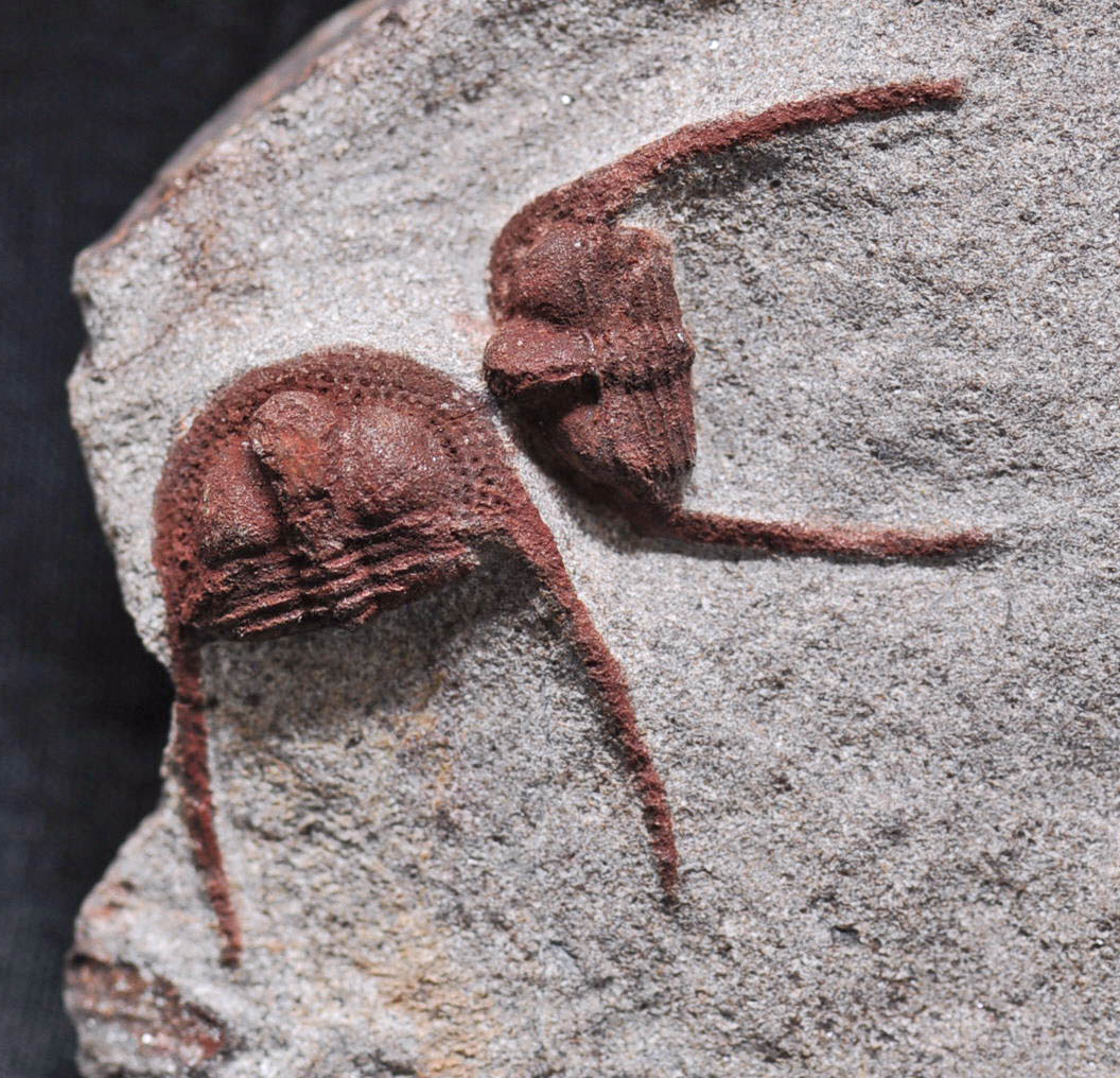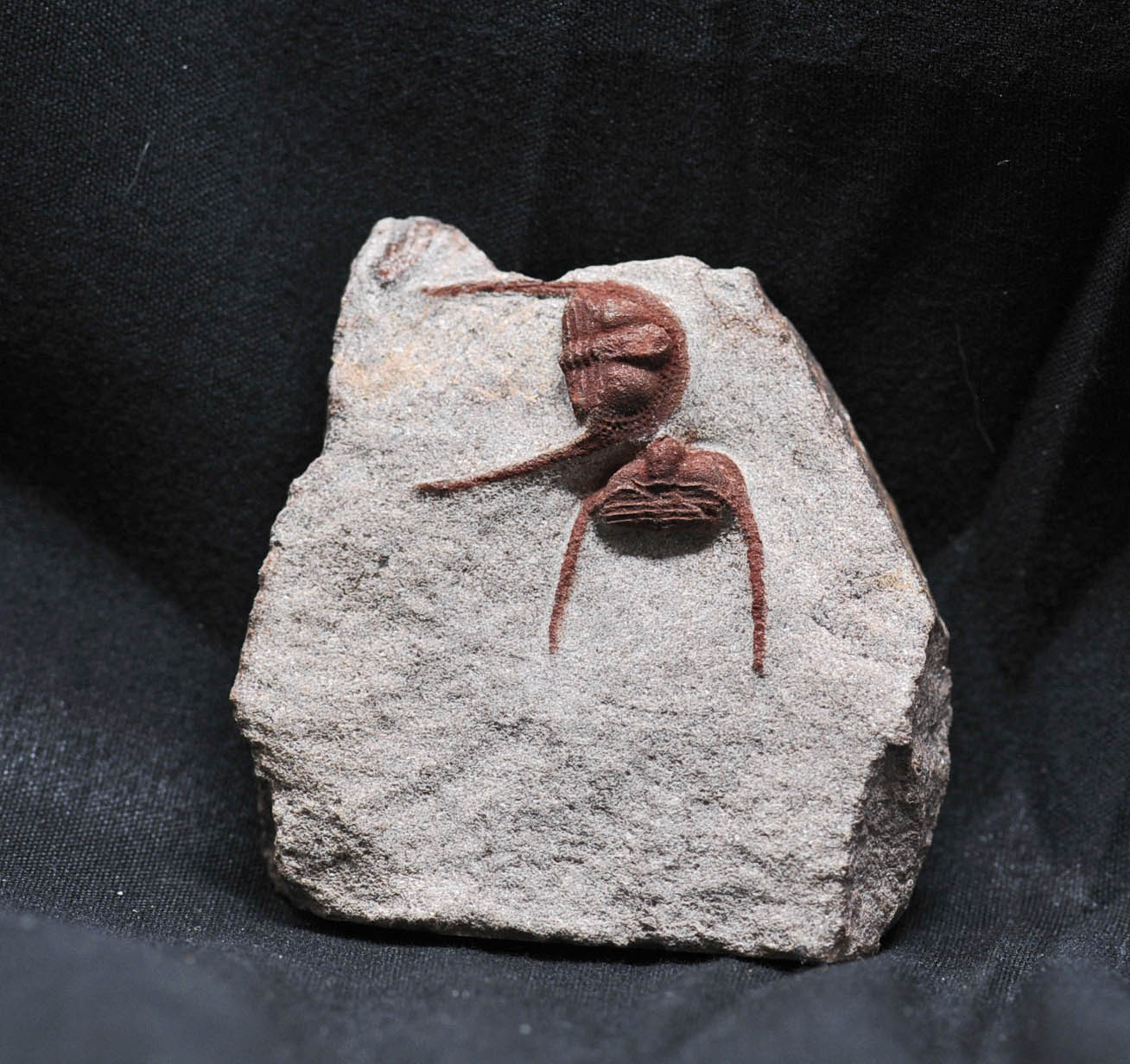 The bodies of both of the fossils have their 'tails' tucked under, but are visible. The fossils are well-preserved- the perforations on the cephalic shields are clearly visible. The color is natural, it is caused by the deposition of iron on the organic material during fossilization.