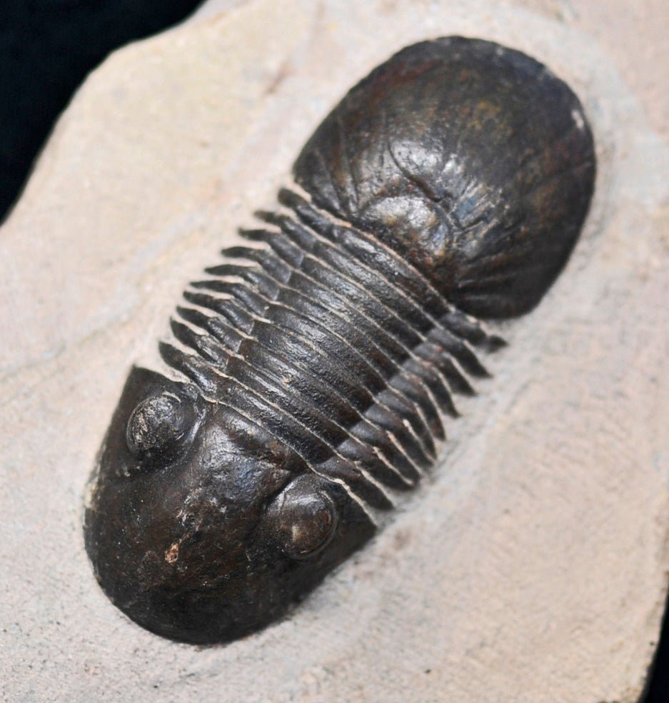 The trilobite measures 2.65 inches long and 1.2 inches wide. The matrix and trilobite measure 4.55 by 3.15 by 1.35 inches. Extremely well-preserved holochroal lenses are present in both eyes. The specimen has been repaired on the tip of the pygidium.