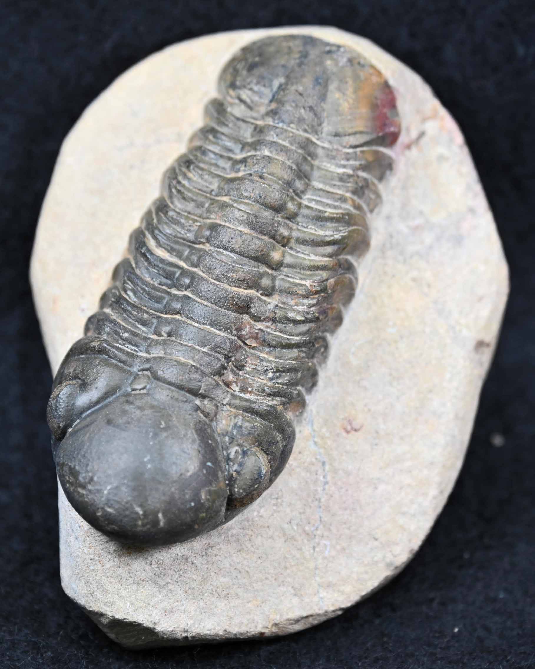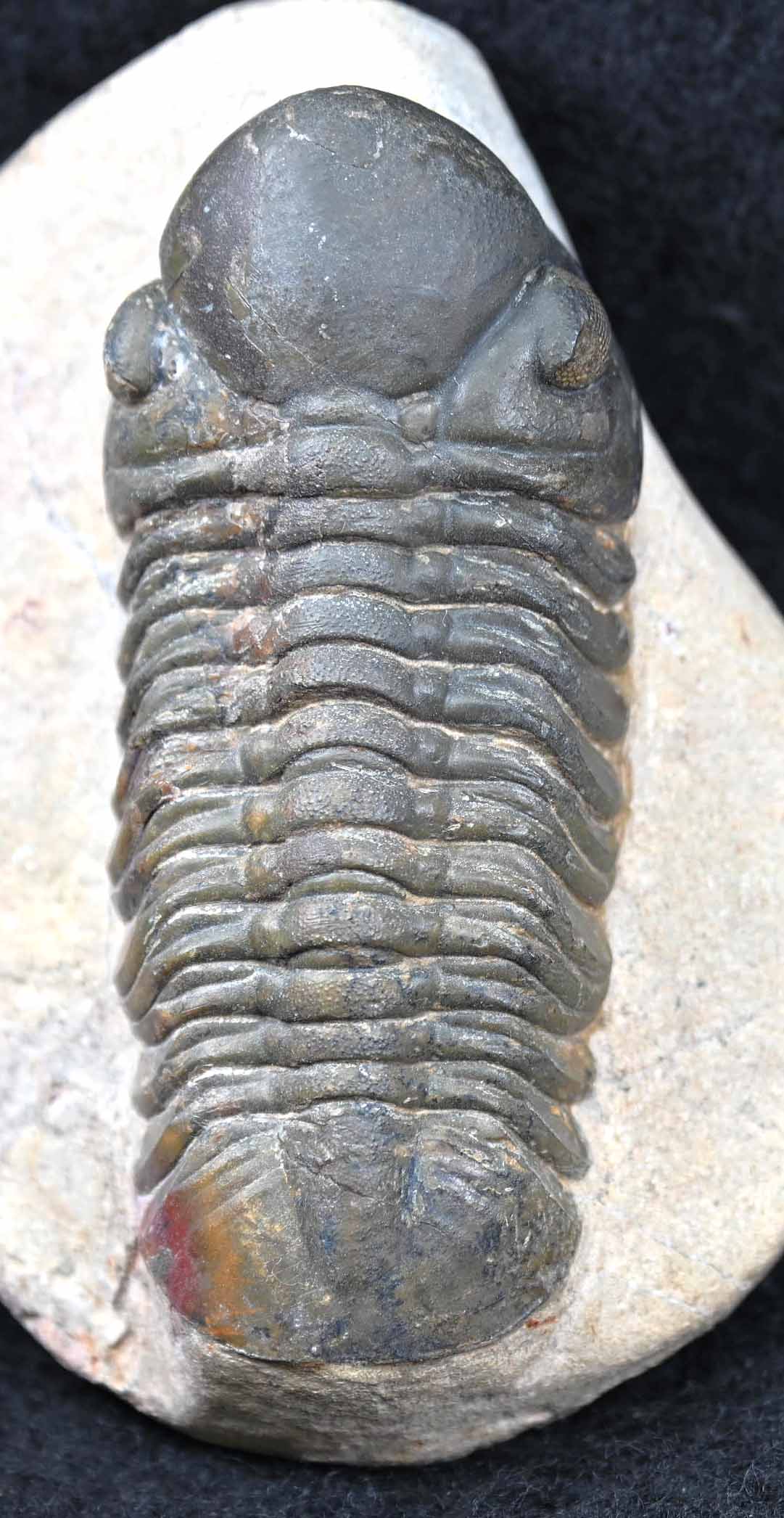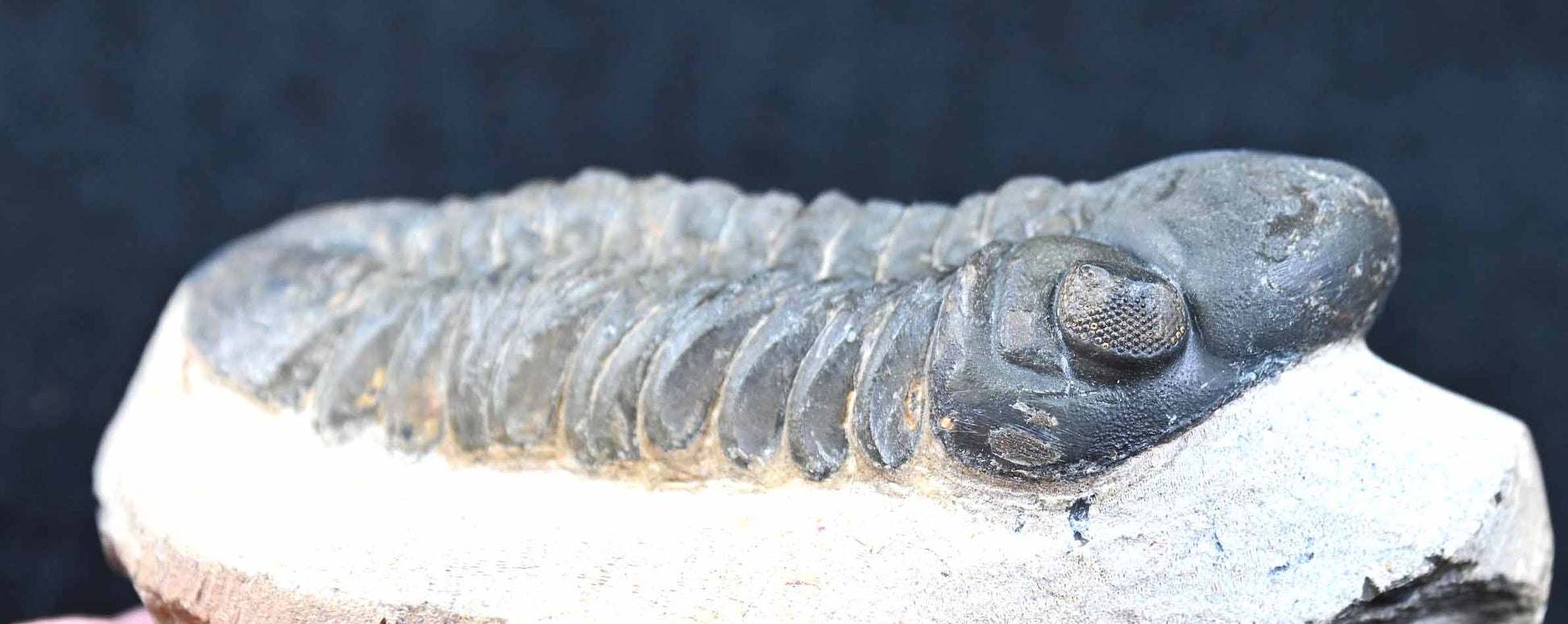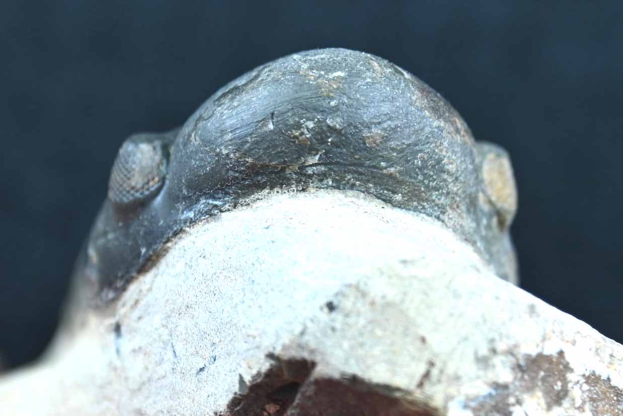 The trilobite is 2.99 inches long and 1.2 inches wide. Trilobite and matrix measure 3.3 inches long, 2.55 inches wide and 1.4 inches high. The schizochroal lenses in both eyes are extremely well-preserved. There is an impression of a Rhombiferan cystoid on the underside of the matrix.