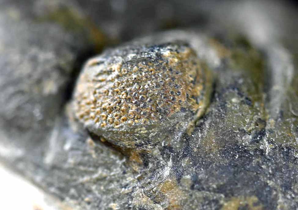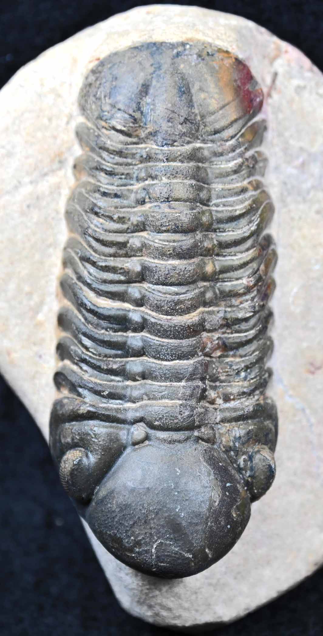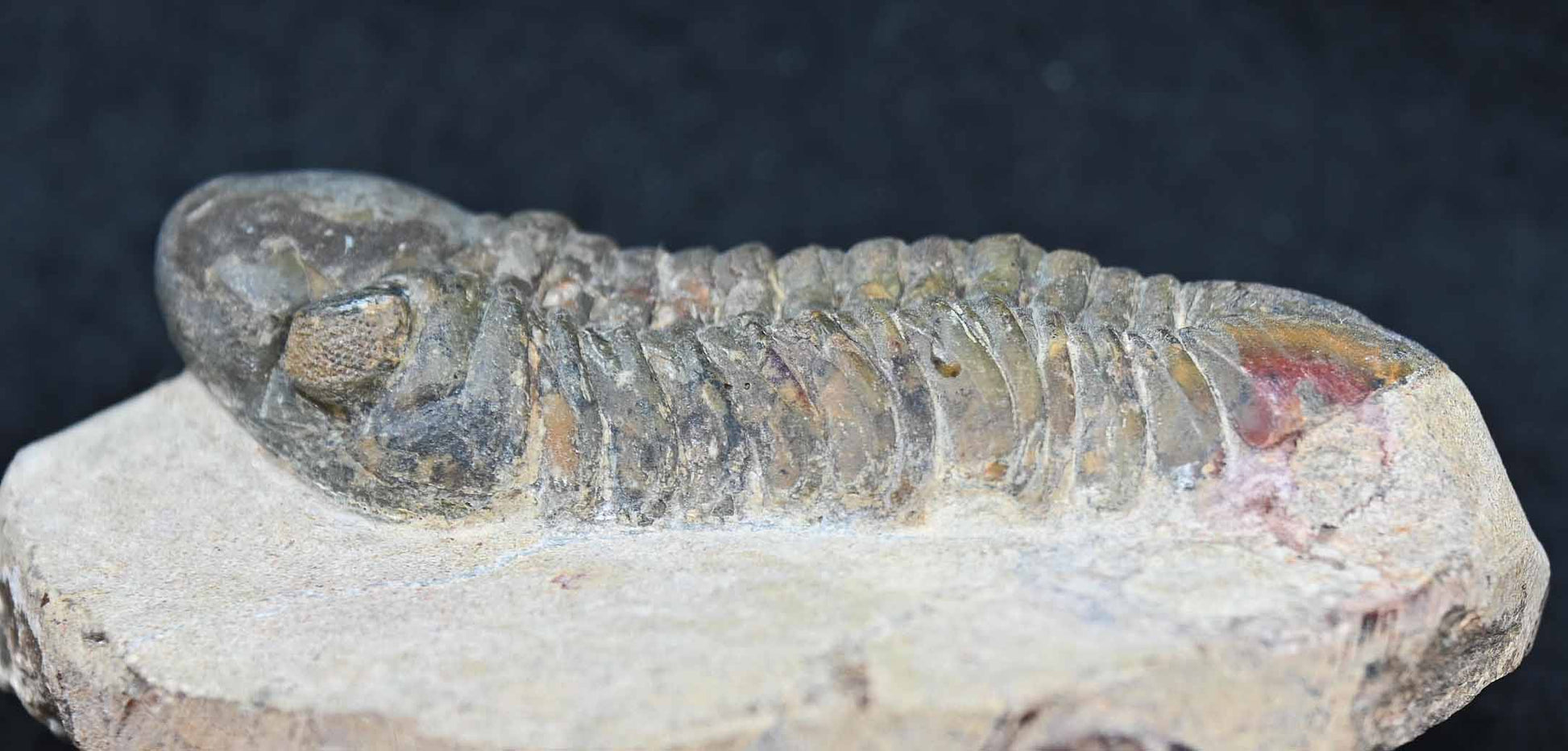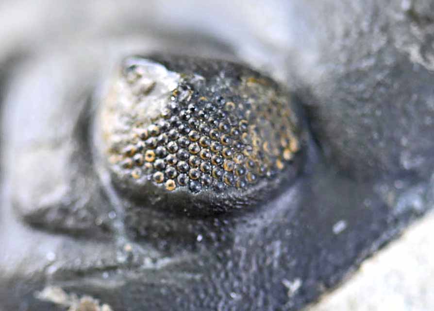 The trilobite is 2.99 inches long and 1.2 inches wide. Trilobite and matrix measure 3.3 inches long, 2.55 inches wide and 1.4 inches high. The schizochroal lenses in both eyes are extremely well-preserved. There is an impression of a Rhombiferan cystoid on the underside of the matrix.