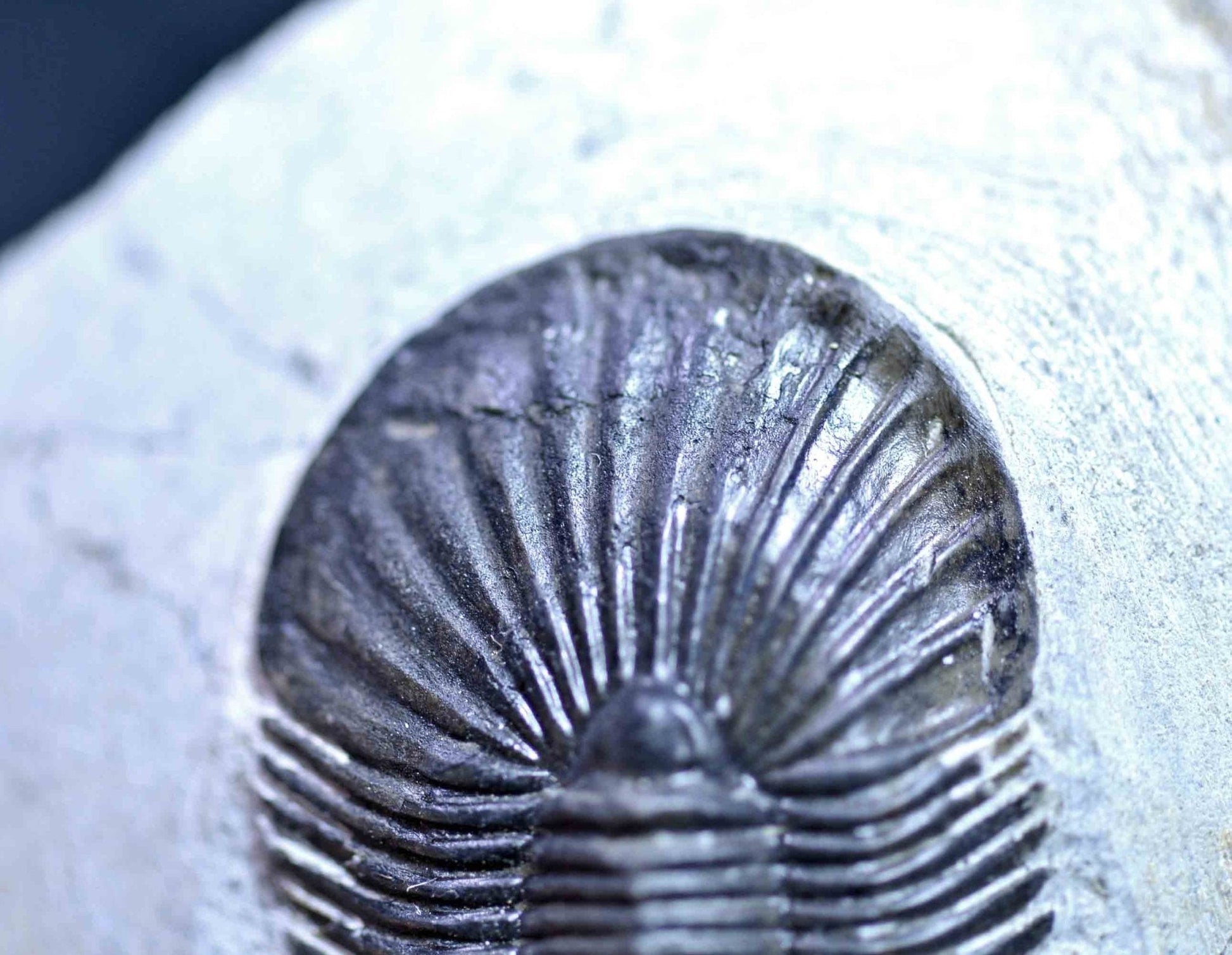 Scabriscutellum hammadi is a Middle Devonian trilobite from Morocco. This specimen has the typical smallish cephalon with protruding eyes, pleurons on the thorax that extend into spines and a ribbed, fan -like pygidium.
