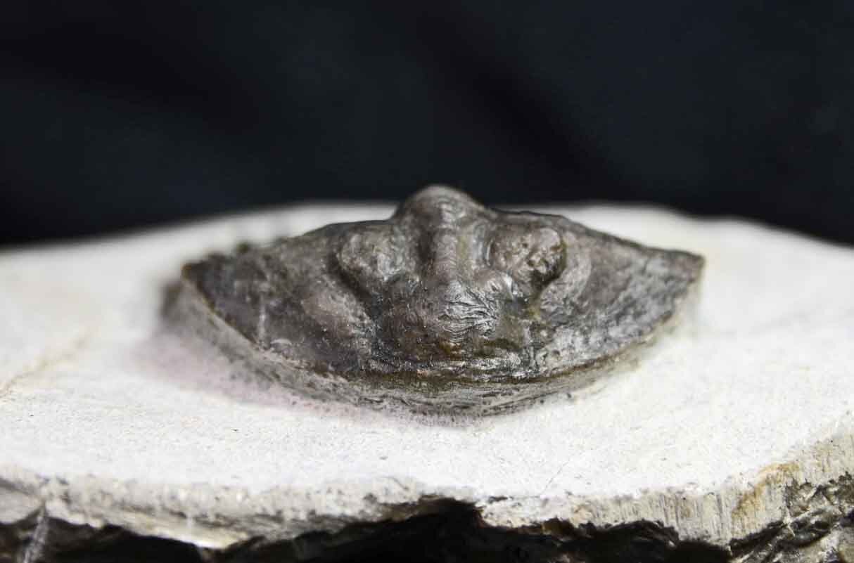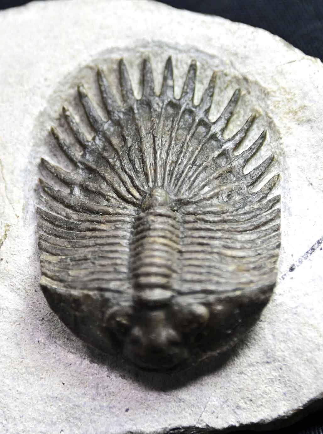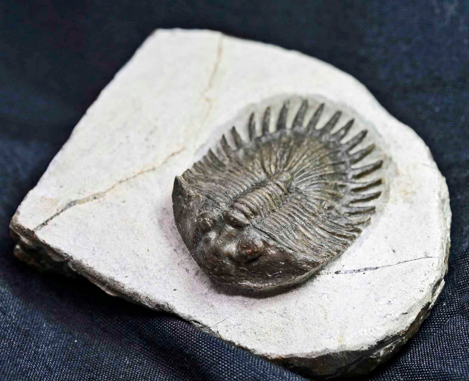 The trilobite is 2.25 inches long and 1.22 inches wide. Trilobite and matrix are 2.55 inches long, 2.99 inches wide and 1.0 inches high. The left cheek has been repaired.