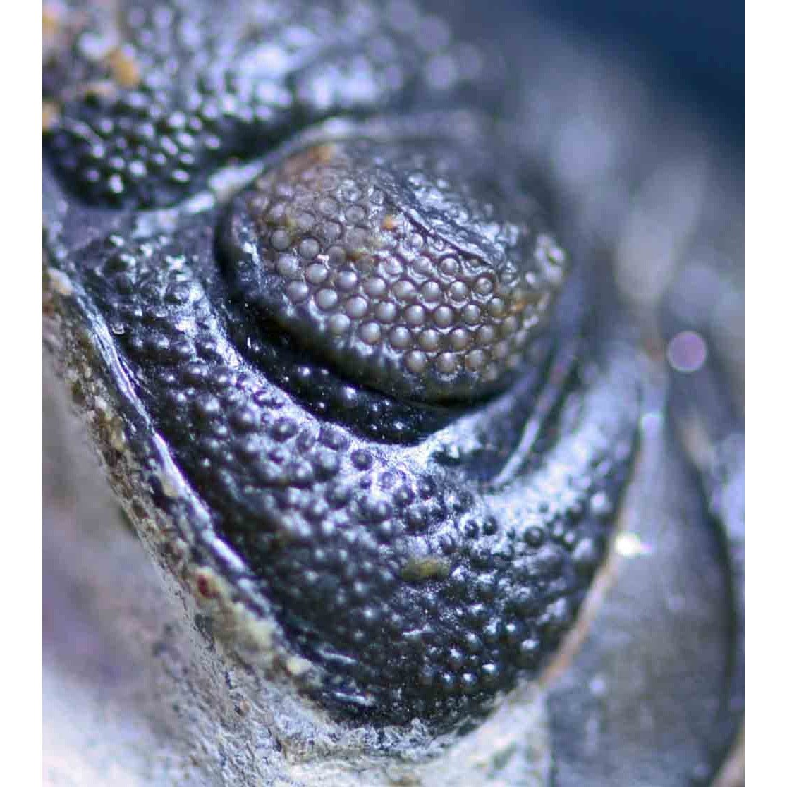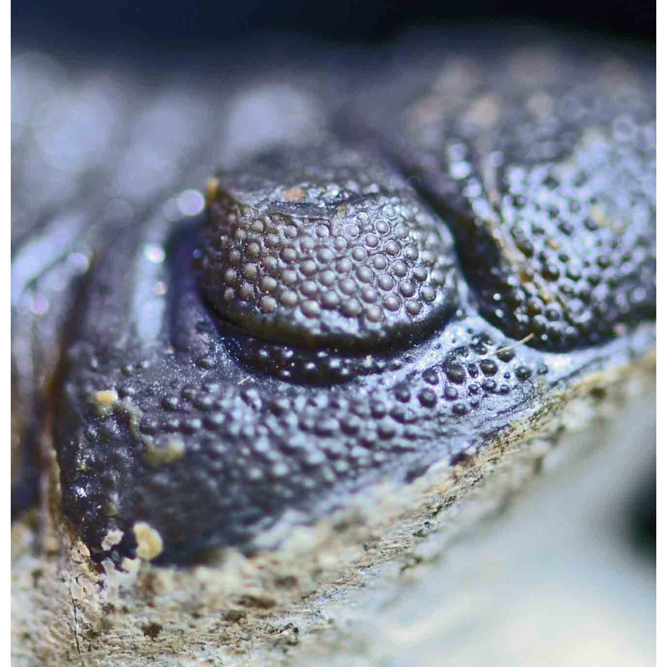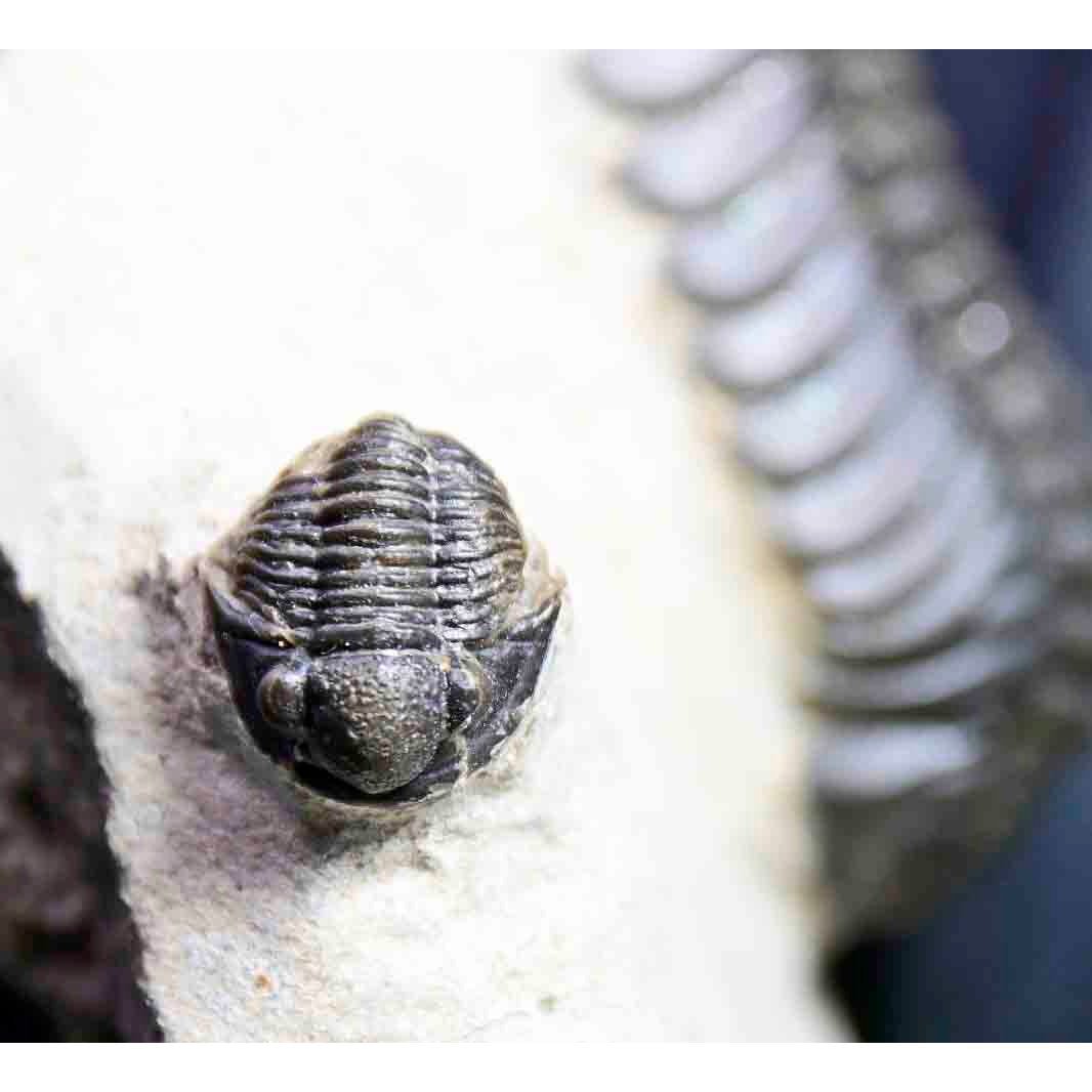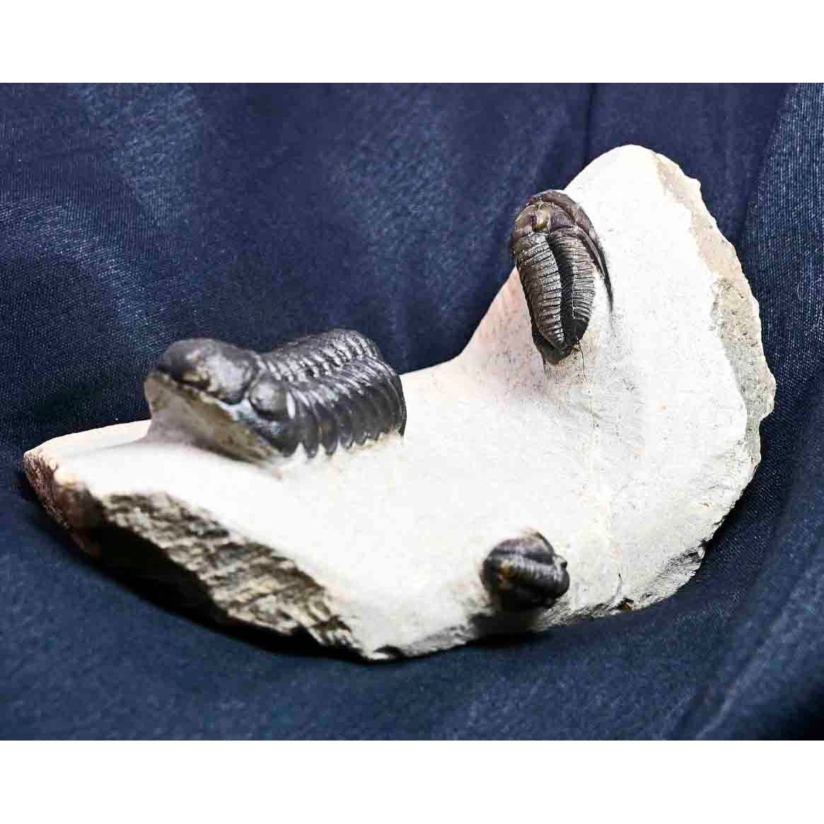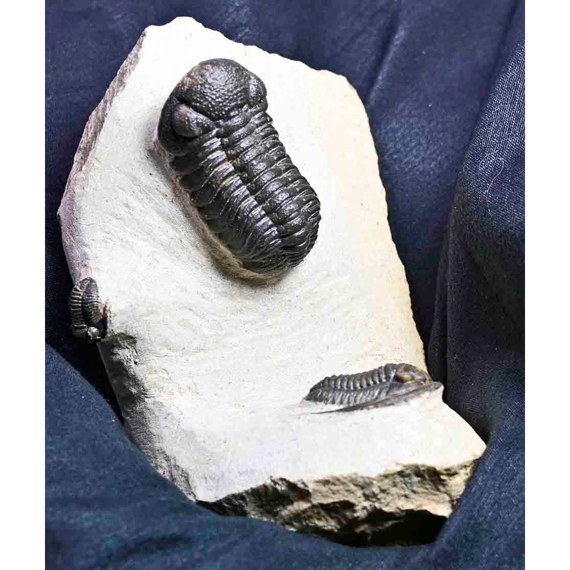 This plate contains 3 of the most iconic trilobites from Morocco. The first is a Phacops (possibly Greenops), the second is a Cornuproetus cornutus and the third is a Gerastos granulosus. They date from the Early/ Middle Devonian, approximately 390 million years ago. The schizochroal lenses in the eyes of the Phacops are well-preserved. The holochroal lenses in the Gerastos and in one eye of the Cornuproetus are intact.