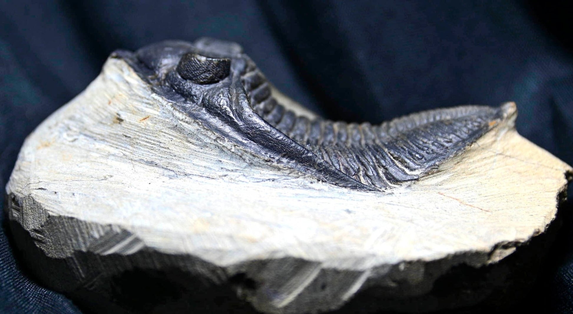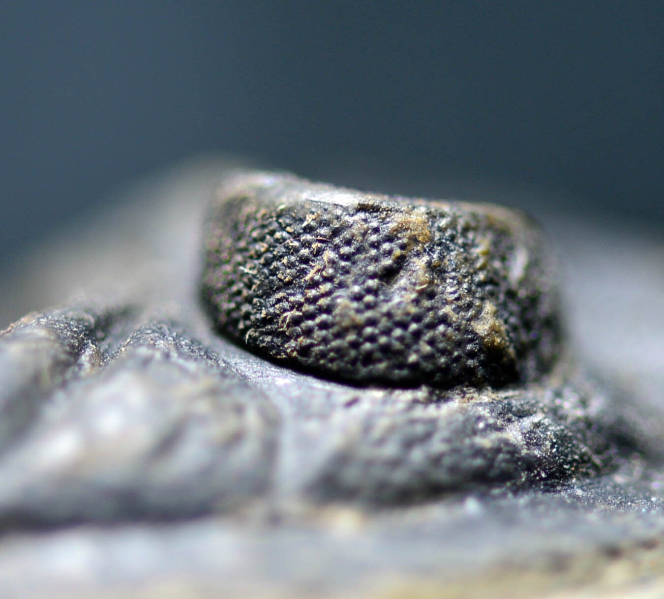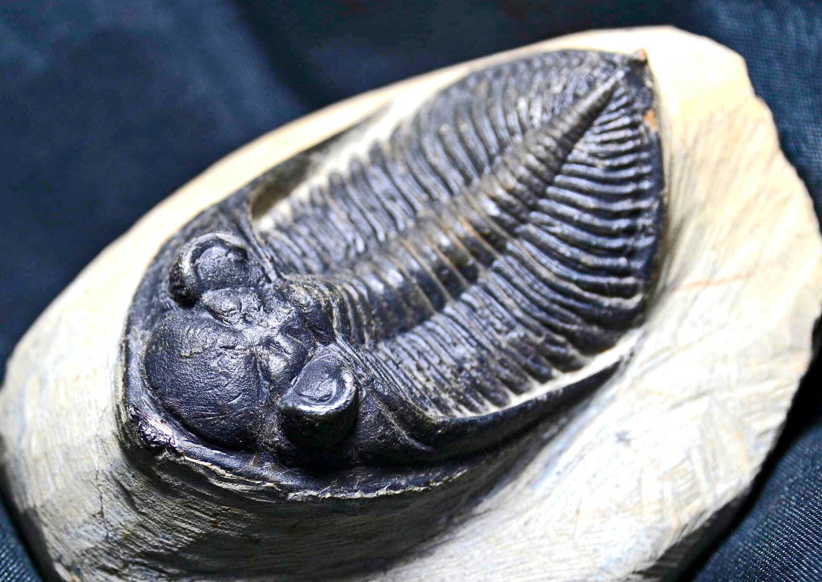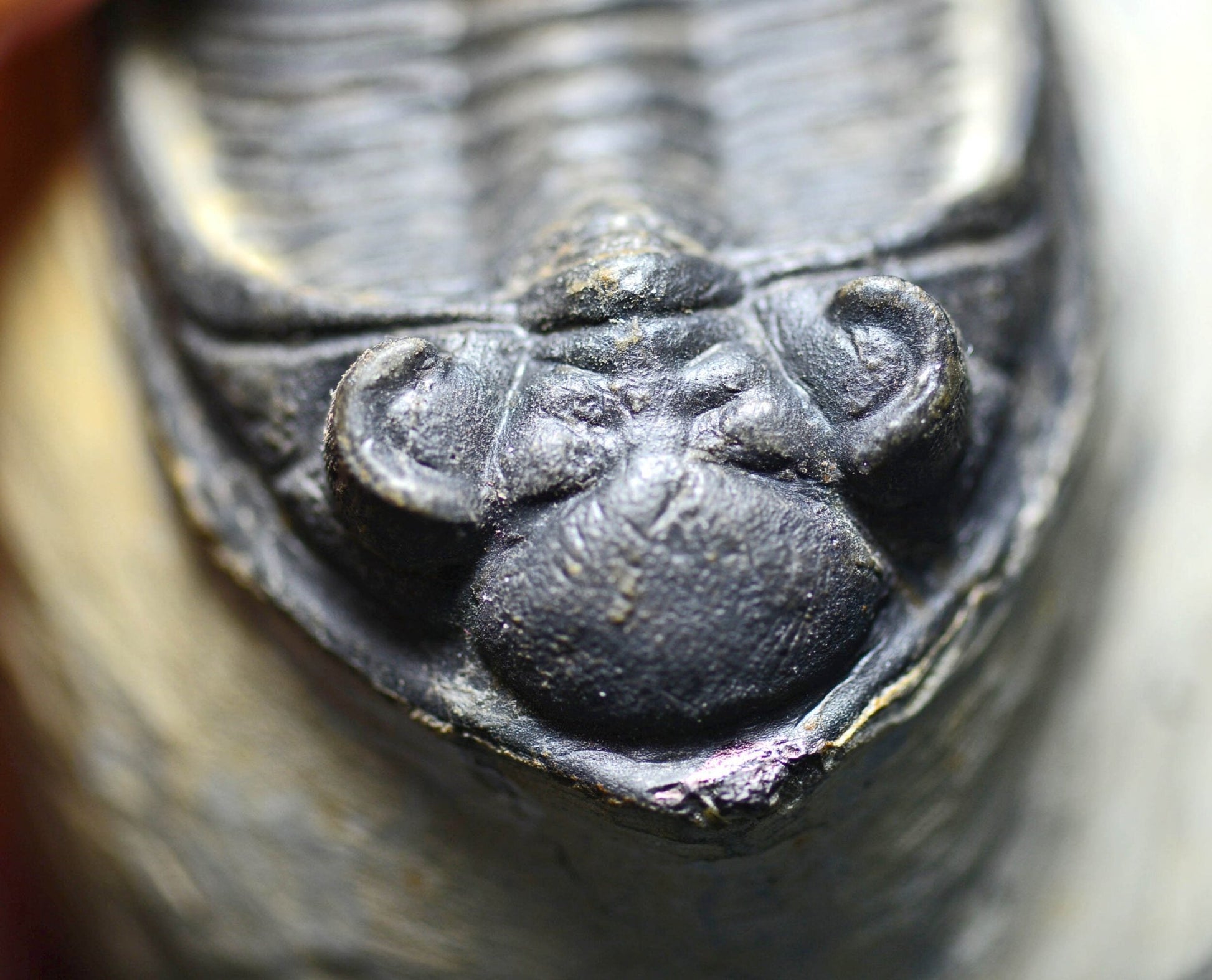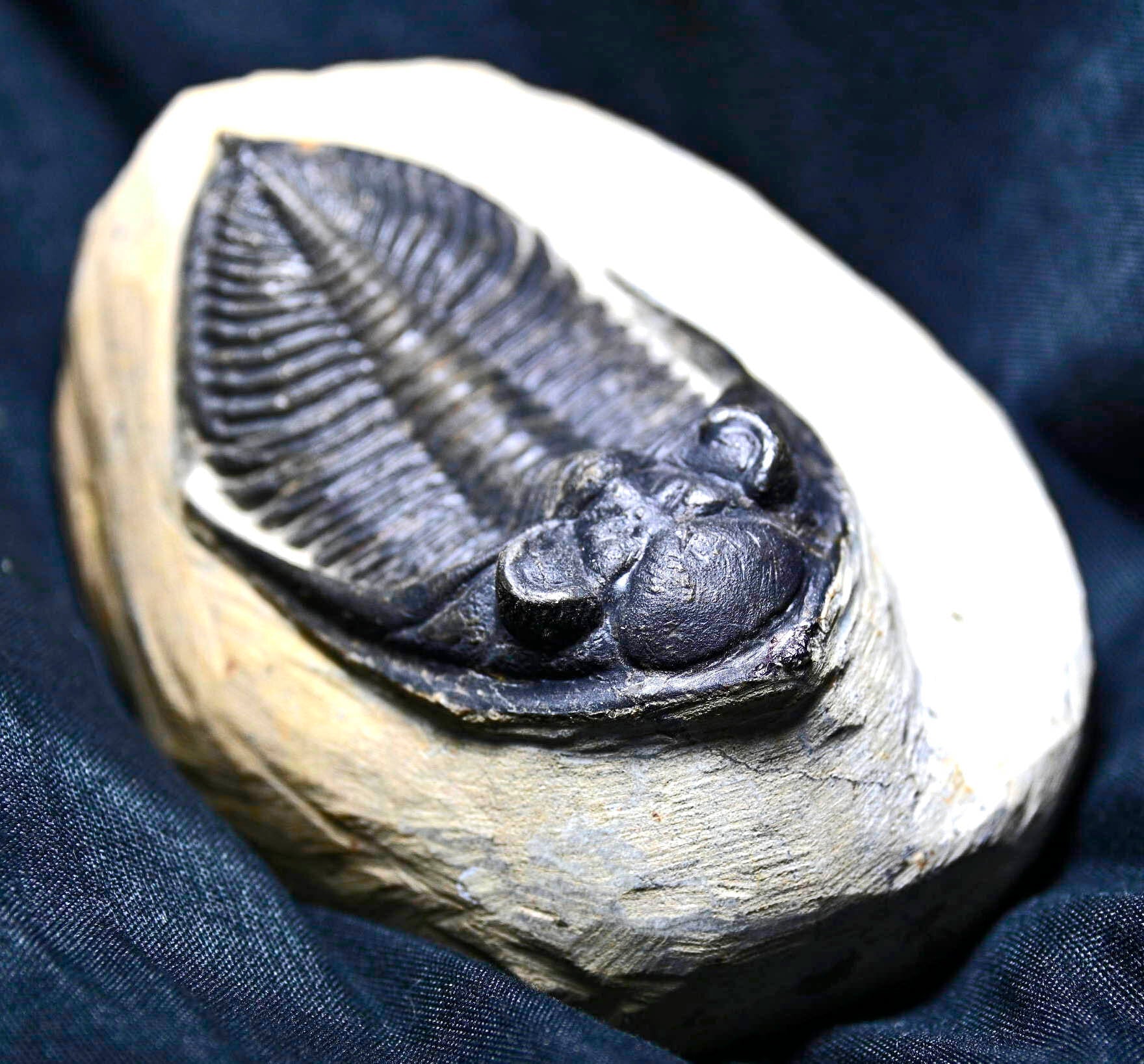The trilobite is 2.88 inches long and 1.76 inches wide. Trilobite and matrix is 3.75 inches long, 2.88 inches wide and 2.0 inches high. Well-preserved schizochroal lenses are present in both eyes.